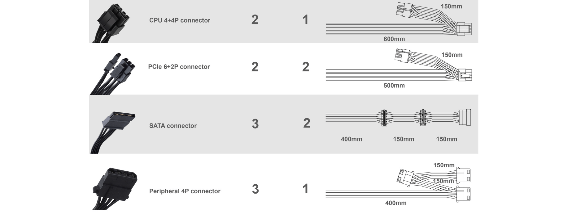 1 x 24 / 20-Pin motherboard connector 2 x 4-Pin + 4-Pin ATX 12V connector 4 x 8 / 6-Pin PCIe connector 6 x SATA connectors 3 x 4-Pin Peripheral connector |