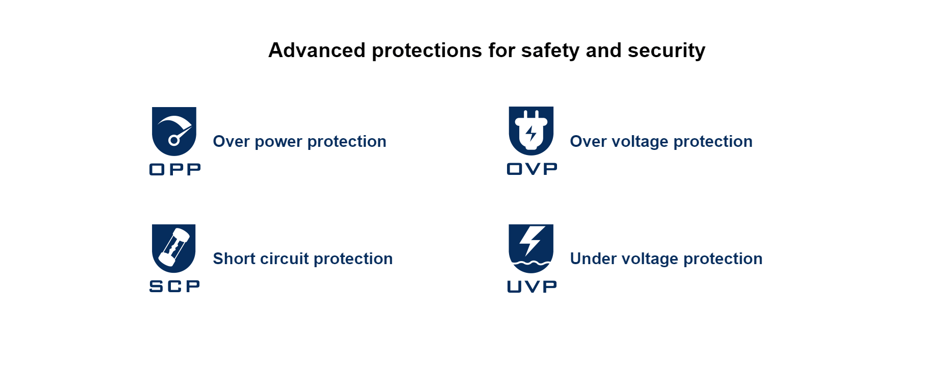 | Protection | Over Power Protection Over Voltage Protection Short Circuit Protection Under Voltage Protection |
