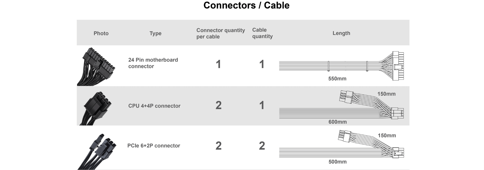 1 x 24 / 20-Pin motherboard connector 2 x 4-Pin + 4-Pin ATX 12V connector 4 x 8 / 6-Pin PCIe connector 6 x SATA connectors 3 x 4-Pin Peripheral connector |