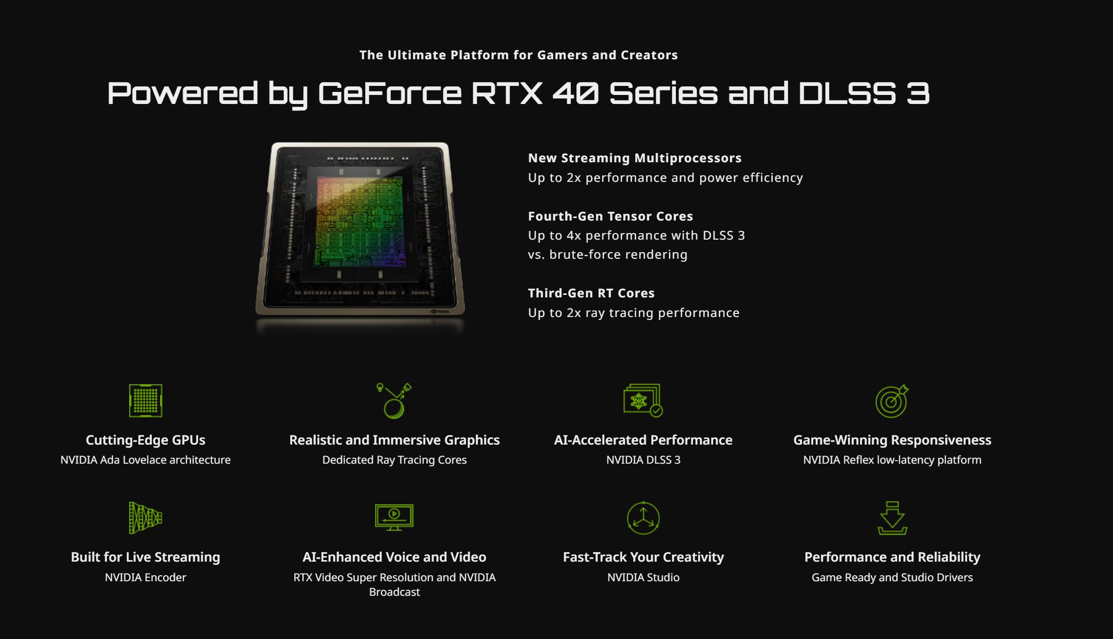 • Powered by NVIDIA DLSS 3, ultra-efficient Ada Lovelace arch, and full ray tracing