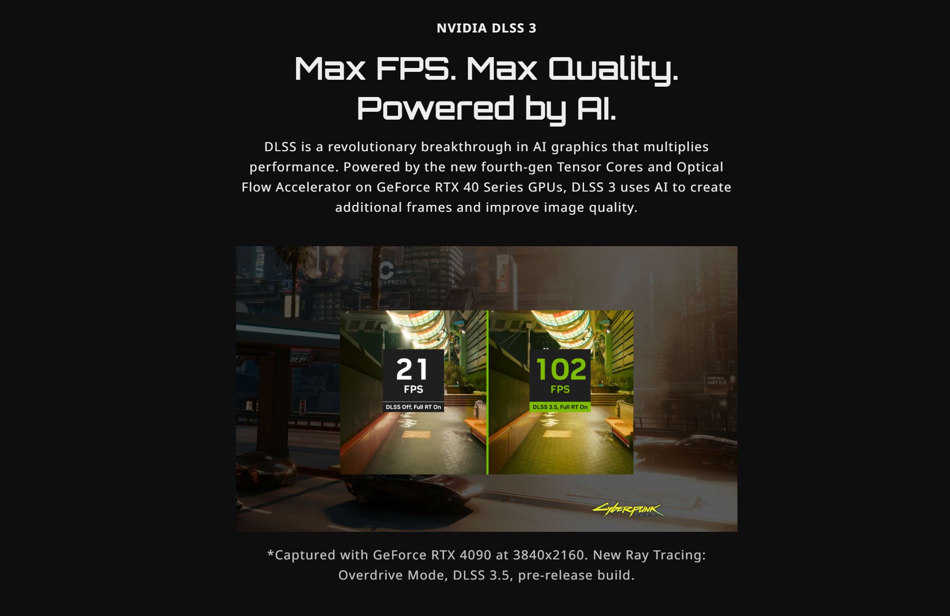 • 4th Generation Tensor Cores: Up to 4x performance with DLSS 3 vs. brute-force rendering