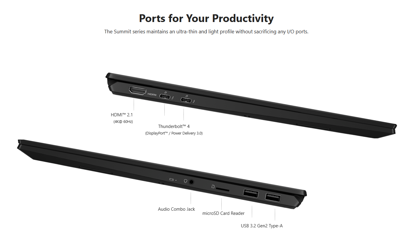 | I/O Ports | 2x Thunderbolt™ 4 (DisplayPort™/ Power Delivery 3.0) 2x Type-A USB3.2 Gen2 1x Micro SD Card Reader 1x HDMI™ 2.1 (4K @ 60Hz) |
