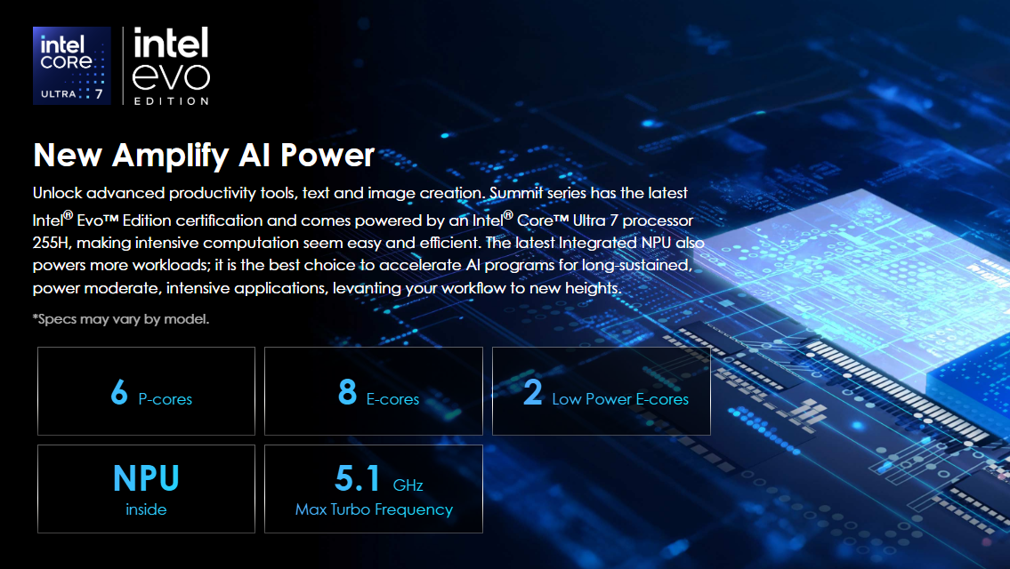 | CPU | Intel® Ultra 7 processor 255H(16Cores,16Threads ,4.4 GHz-5.1 GHz) |
