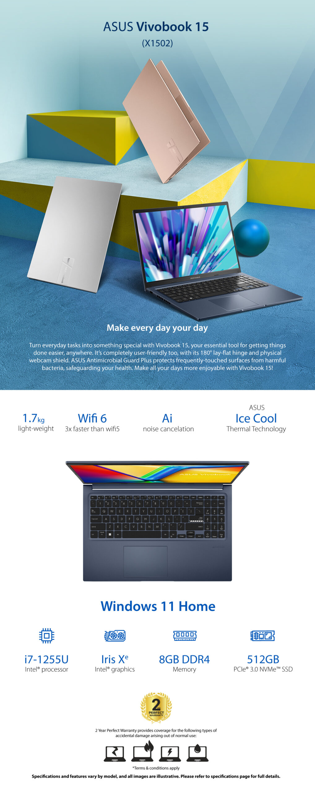 Work and create with confidence using the ASUS Vivobook 15 X1502ZA, a sleek 15.6-inch laptop powered by an Intel Core i7-12700H processor, 8GB RAM, and 512GB SSD. Designed for productivity and everyday multitasking, it features Intel UHD Graphics, a Full HD display, and runs on Windows 11. Ideal for users searching for Asus laptops, Intel i7 laptops, 15-inch productivity laptops, and Windows 11 notebooks for work or study.